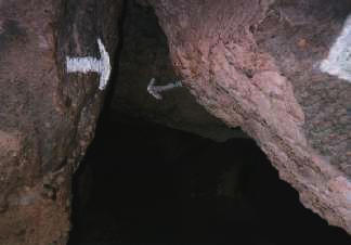 A narrow section of the cave is marked by white arrows, as if to