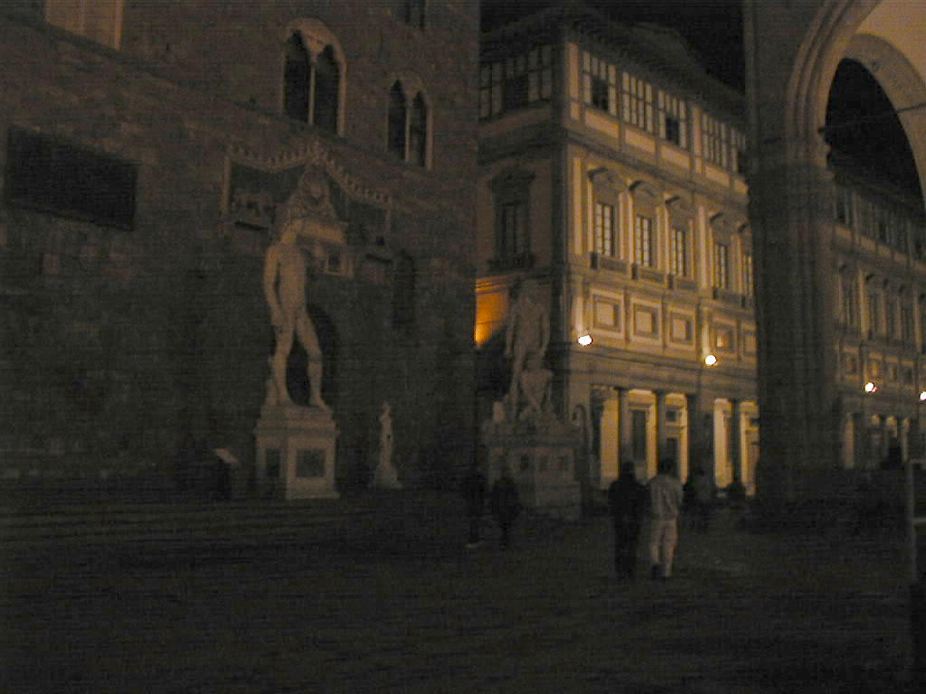 The replica of the David and the Galleria Uffizi at night.