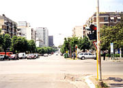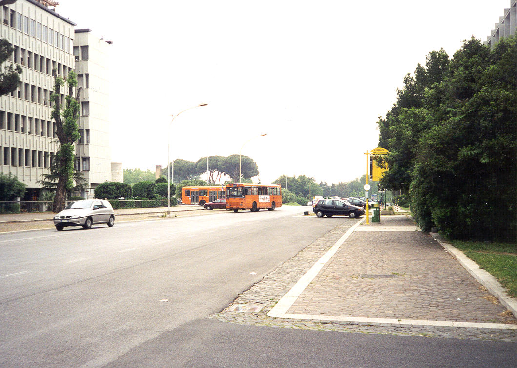 A view of the street outside our apartment building. As another sign of Italian reliability, one bus is stalled in the street, while another bus approaches.