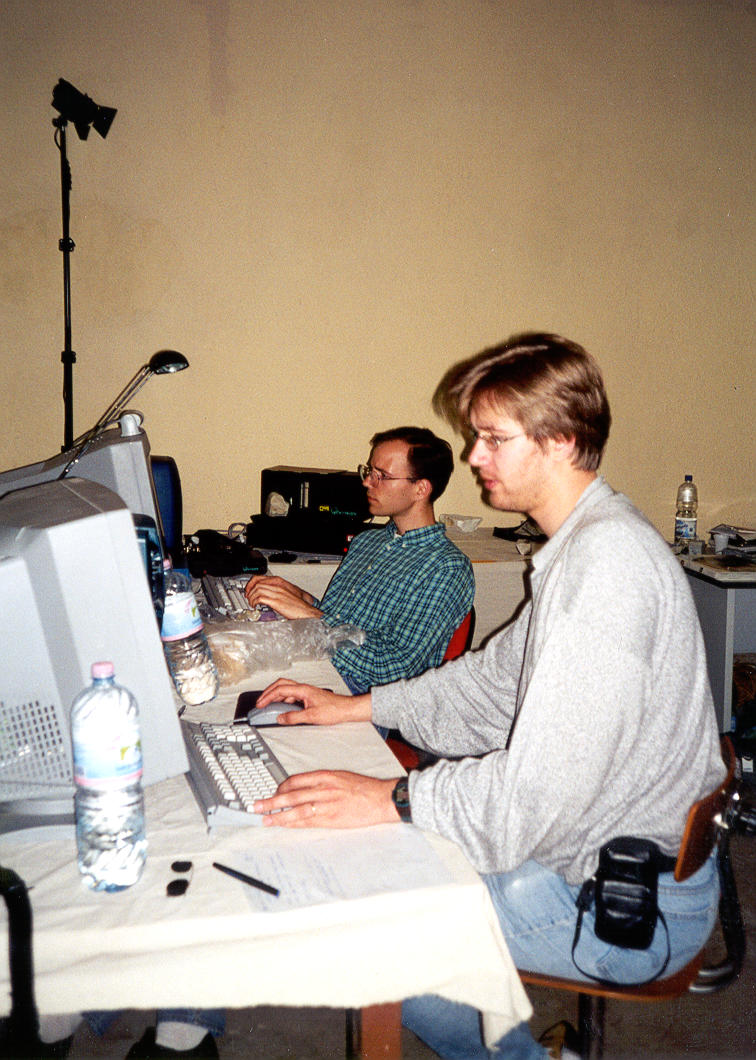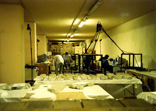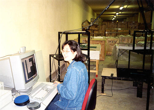 Another picture of us at work. On the right you can see our "photograph station", where we took digital photos of each fragment that we scanned.