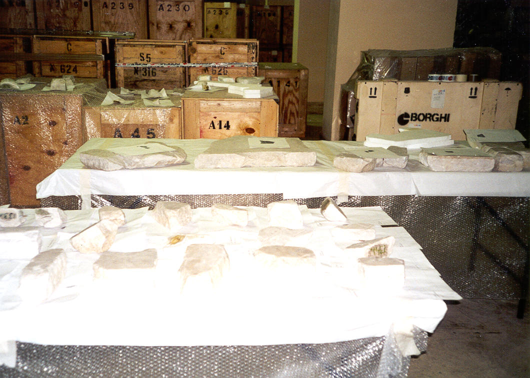 Just a few of the 1300 "rocks" (map fragments), laid out carefully on bubble wrap, with their identification papers. The crates in the background contain rocks still yet to be scanned.