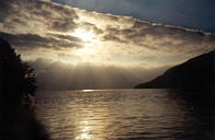 Sunlight streams through the clouds over one of the lakes near Interlaken.