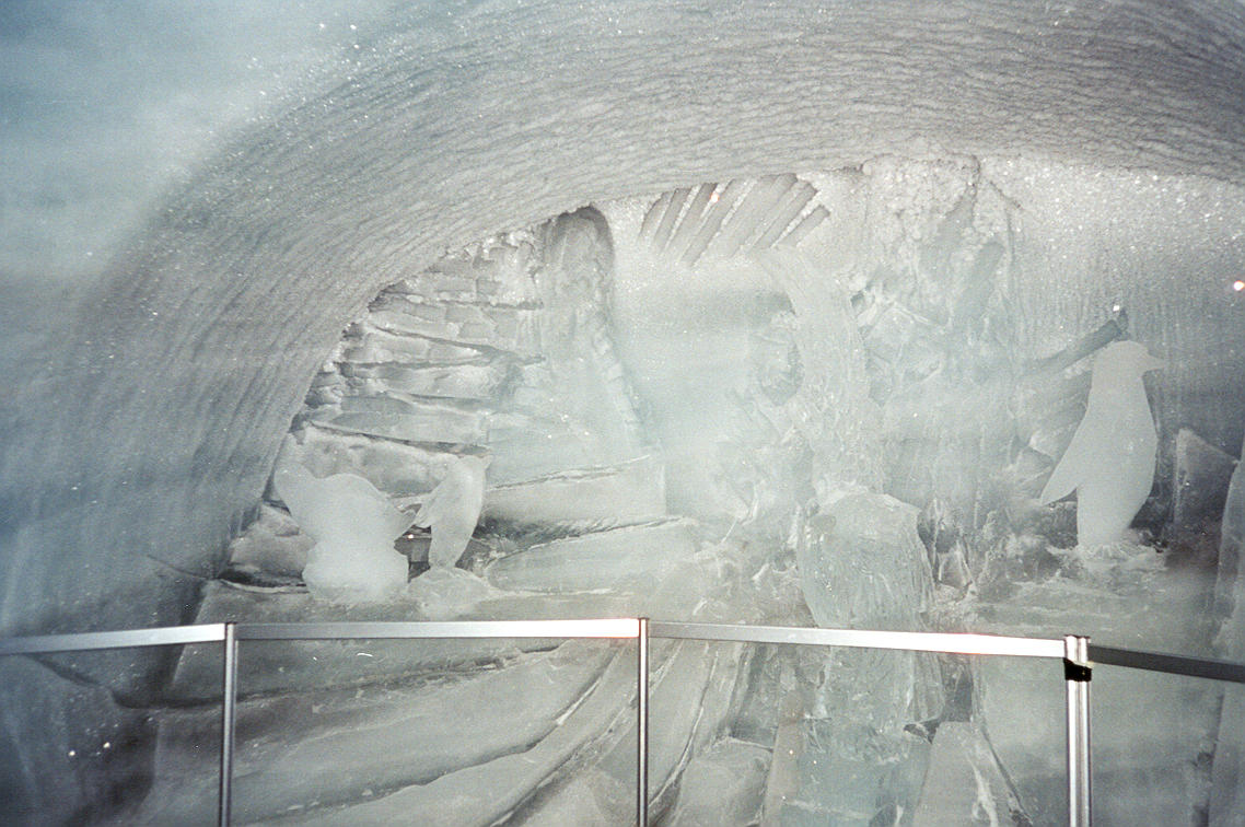 ++ It features a number of ice sculptures, such as these penguins. Notice in the background, how you can see the strata of ice. |