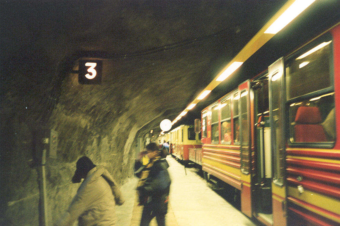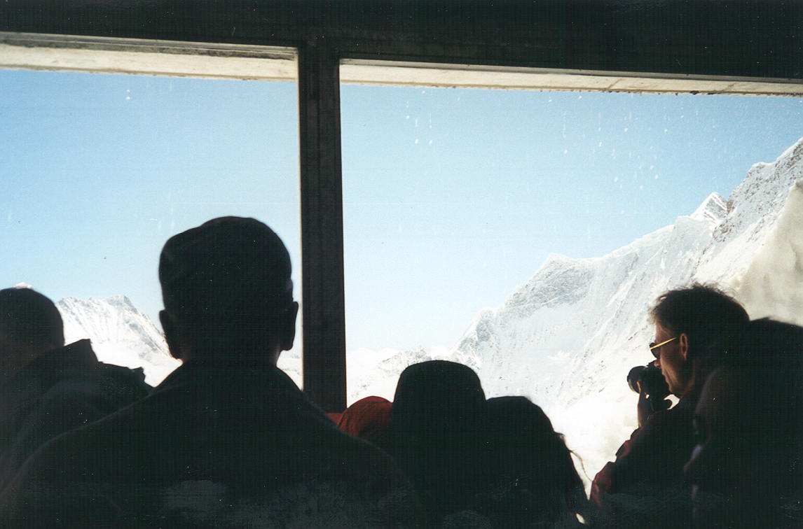 ++ Jungfraujoch station. Here we are standing outside on the glacier, at train station level. The observation deck sits high atop this rock spire. You can see part of it on the left. An elevator climbs up from the station to the observatory in a mere 25 seconds, reaching speeds of 15 mph. |
