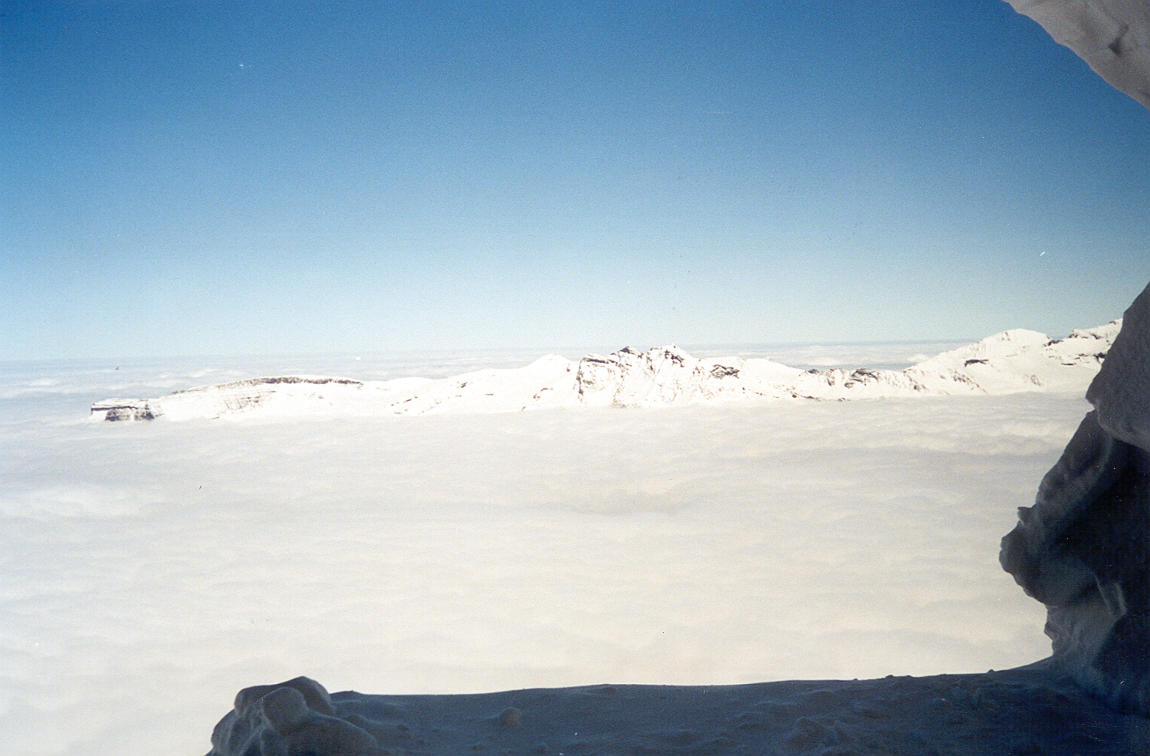 ++ Here's the view from the first station, just slightly above cloud level. Notice the snow piling up against the window on the right and bottom. The window is just flush with the face of the mountain. |