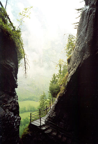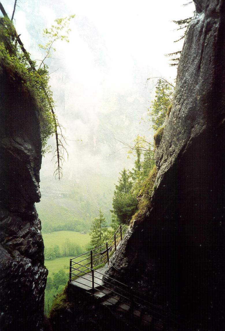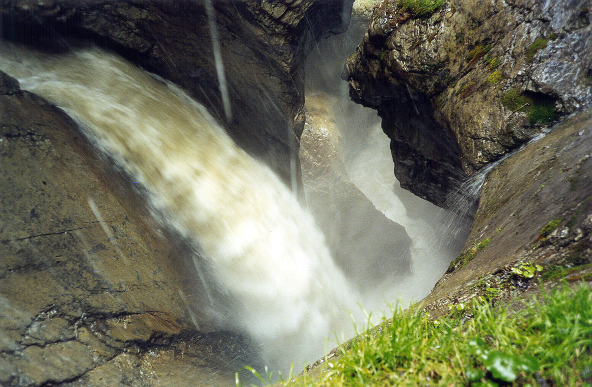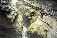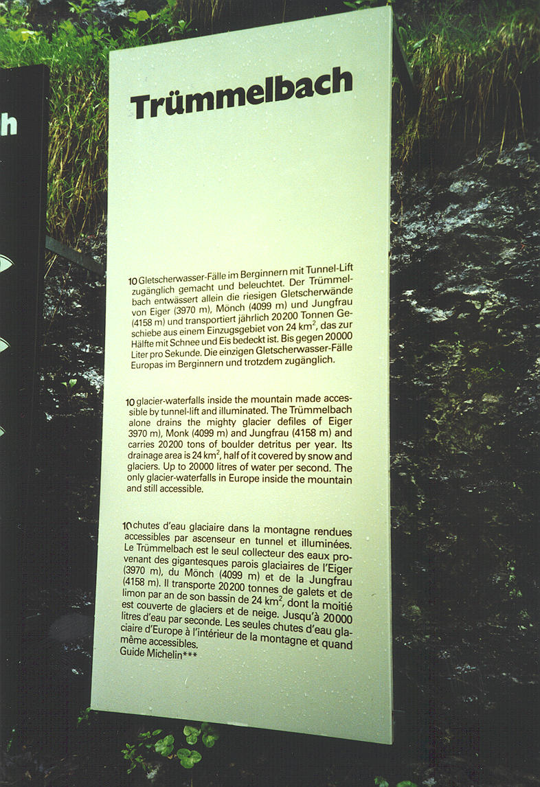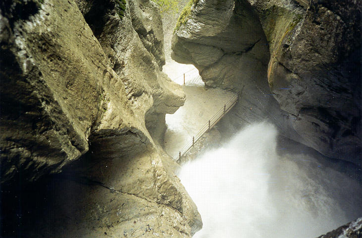 ++ Trummelbach. 10 glacier-waterfalls inside the mountain made accessible by tunnel-lift and illuminated. The Trummelbach alone drains the mighty glacier defiles of Eiger (3970 m), Monk (4099 m) and Jungfrau (4158 m) and carries 20.200 tons of boulder detritus per year. Its drainage area is 24 km2, half of it covered by snow and glaciers. Up to 20.000 litres of water per second. The only glacier-waterfalls in Europe inside the mountain and still accessible. |