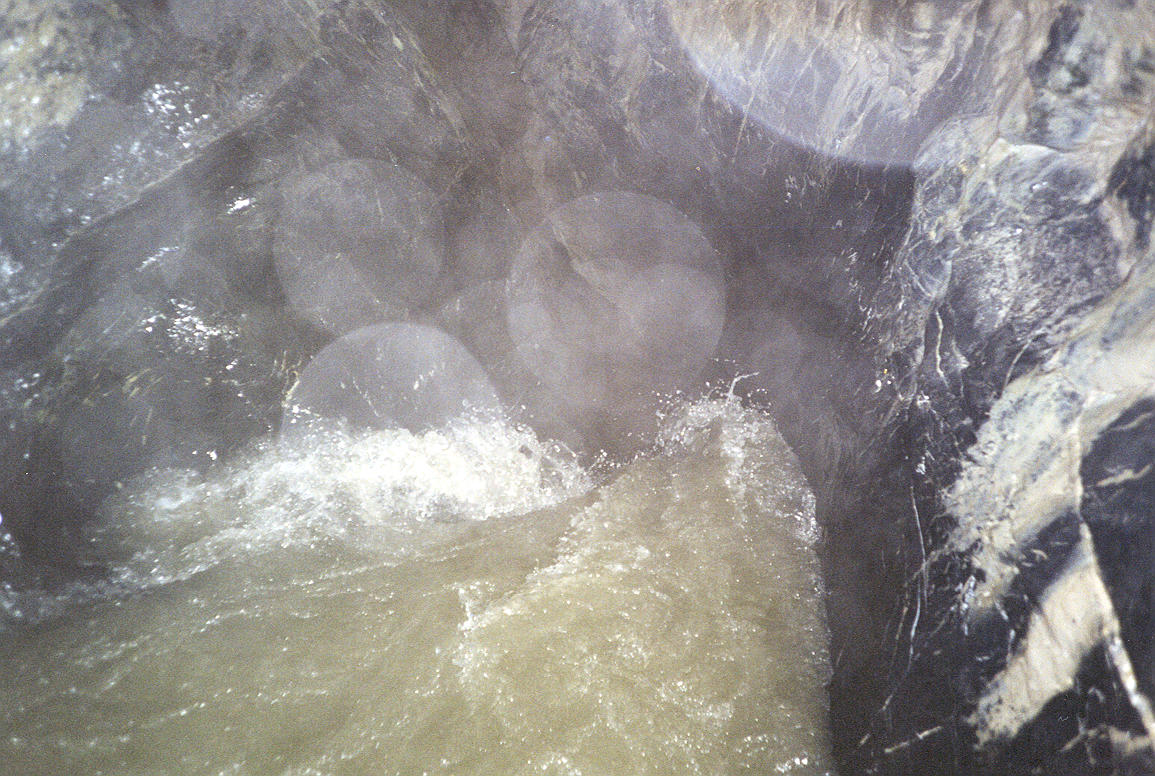 ++ The water disappears down a hole. Mist droplets close to the camera reflect the flash, causing white circles. |