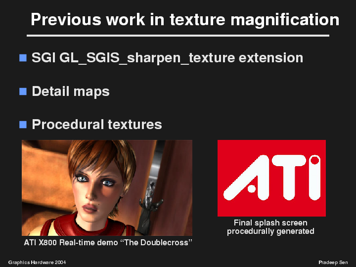 One great example of a procedural texture used in this way is the final "ATI" splash screen at the end of the ATI "DoubleCross" demo featuring Ruby. The developers wanted the final ATI texture which you zoom into to be sharp all the way and did not want to waste a lot of memory doing so. So they used a fragment program and worked out the equations necessary to figure out if the pixel is in the red or white regions and shaded them appropriately. This yielded a texture that was sharp even under extreme magnification.