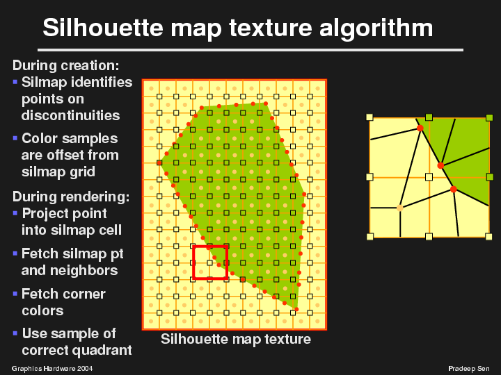 By moving the silhouette points to be on the discontinuity, we are effectively deforming the cells of the texture to better match the underlying image. Thus we get improved magnification, since we are really performing a piece-wise linear approximation of the underlying texture contours.