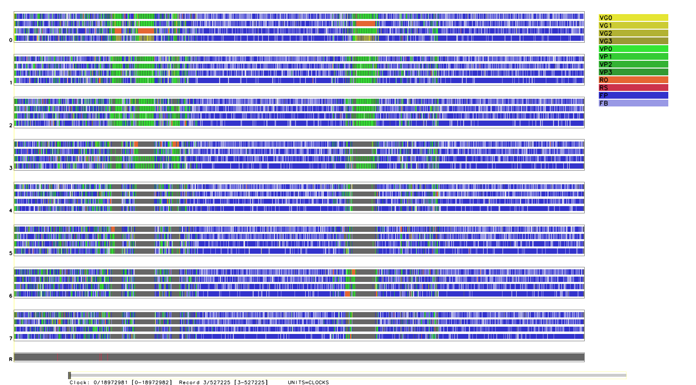 It's worth noting that the lazy scheduler has exactly footprint trade-off against the eager scheduler that one would predict. Here is the same occupancy picture for the eager scheduler. It goes through far more vertex - fragment - blend cycles and has the pipeline bubbles from exhausting all fragment work, but not being able to fill the machine with vertex-work alone. The thing is, lazy does not have significantly better thread slot occupancy and (unsurprisingly) it has a much higher queue footprint. The lazy scheduler gets 95.3% occupancy with a 5.5 meg worst case queue footprint. The eager scheduler gets 95.0% -- almost the same -- but has a 1.3 meg footprint. Clearly I need to understand the bubble in the lazy scheduler. It may also be that eager will be unfairly successful so long as scheduling is 'free'.